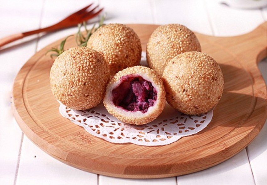 Chiếc bánh rán lúc lắc vàng rộm phủ kín bởi lớp vừng trắng thơm phức bên ngoài và phần nhân khoai bùi ngọt bên trong thật ấn tượng và hấp dẫn!