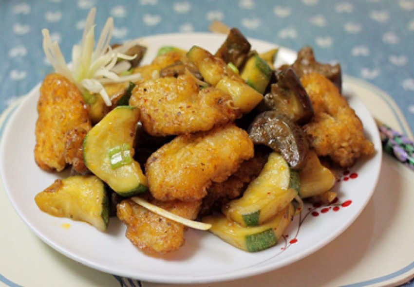 Thịt cá ngọt được bọc trong một lớp bột vàng giòn, xào cùng với cà tím, bí ngồi, ăn không ngấy như món cá rán thông thường.