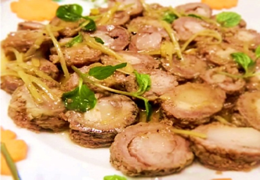 - 9Lấy thịt ra khỏi nồi, để nguội hẳn rồi gỡ dây chỉ, rút tăm, sau đó thái khoanh và bày ra đĩa.