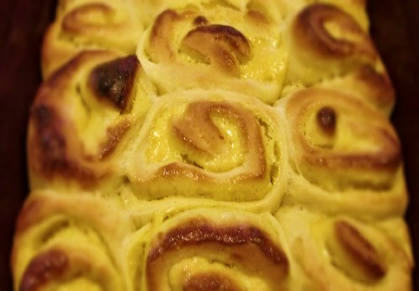 - 8Dùng mứt chanh quét đều lên phần bột mỳ đã lăn mỏng làm nhân bánh, sau đó cuộn lại. Dùng dao cắt thành từng khúc nhỏ và cho vào khay nướng. Trước đó quét một lớp bơ hoặc xịt một lớp dầu ăn lên khay nướng để bánh không bị dính. Sau đó dùng một cái khăn sạch đậy lên trên để ủ bột thêm một lần nữa. Thời gian này mất khoảng 30 đến 45 phút.