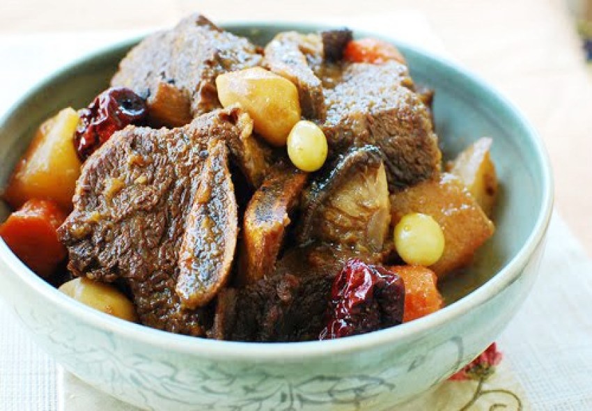 - Cho hạt dẻ, chà là, hạt bạch quả vào nhưng không đậy vung và đun nhỏ lửa từ 10-20 phút nữa hoặc cho đến khi nước xốt dày lên và thịt mềm nhưng không nát là được. Cho sườn bò kho nấm ra bát và thưởng thức với cơm nóng.
