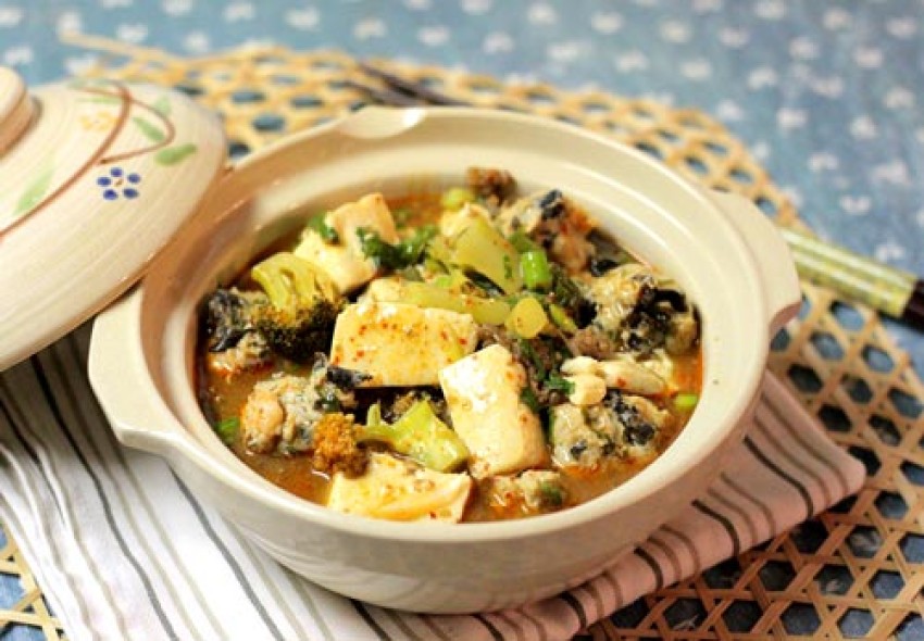 - Sau đó, đun lửa nhỏ khoảng 12 phút, nêm nếm lại gia vị cho vừa ăn, đun tiếp thêm khoảng 10 - 15 phút đến khi phần đậu phụ thấm gia vị và thịt chín. Trong khi đó, hòa tan bột năng với hai thìa nhỏ nước lạnh.