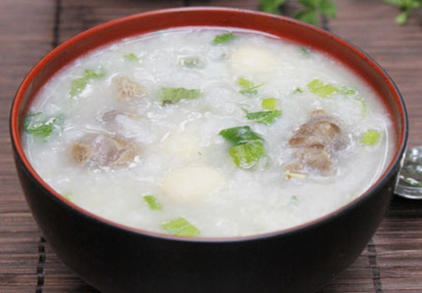 Bát cháo nóng hổi với vị thơm ngọt của thịt bò bắp, được nấu cùng với hạt sen ăn bùi bùi, và thơm mát của đỗ xanh.