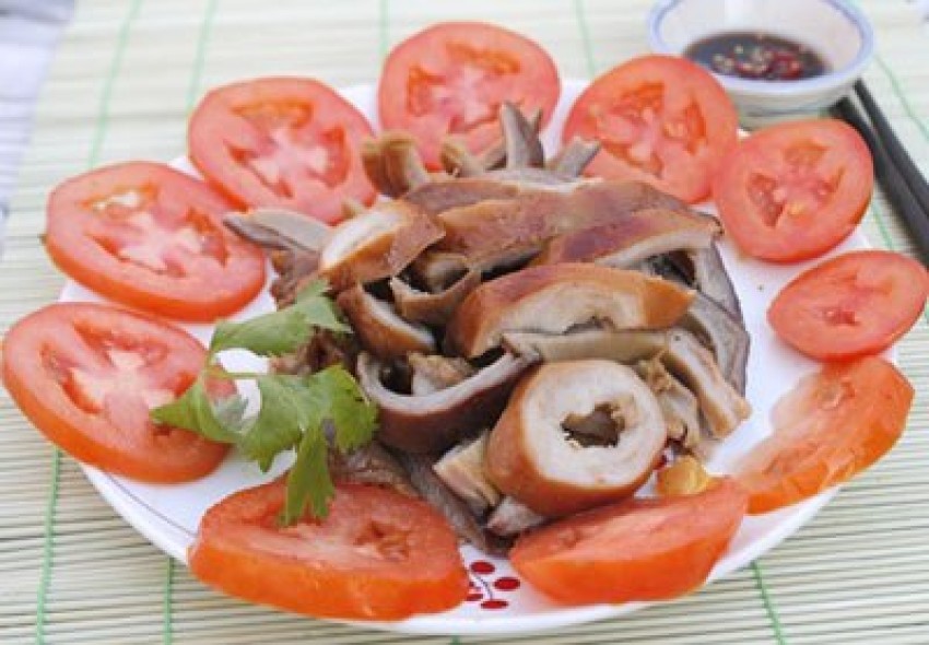 Đây là món ăn gần giống với kho nhưng thơm hơn với vị ngọt của nước dừa, thơm, dai, giòn của dạ dày, chấm với xì dầu pha ớt.