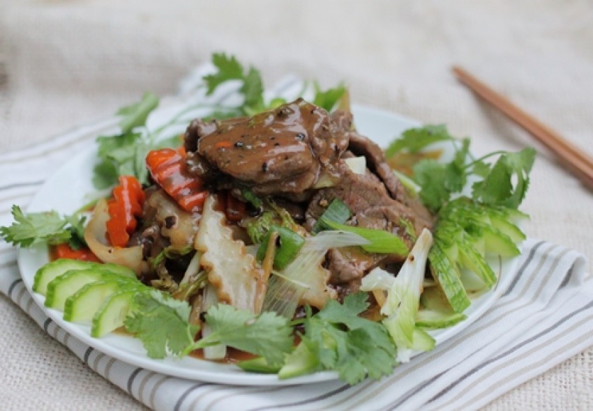 - Hạt tiêu xanh, tiêu đen, giã thô. Thịt bò rửa sạch, cắt lát vừa ăn, dần mềm, ướp vào bát thịt hạt tiêu xanh, tiêu đen, bột năng hoặc bột ngô, 1 thìa canh xì dầu, 1 thìa nhỏ dầu hào, 1 thìa nhỏ đường cát trắng, trộn đều, ướp khoảng 1 đến 2 tiếng.