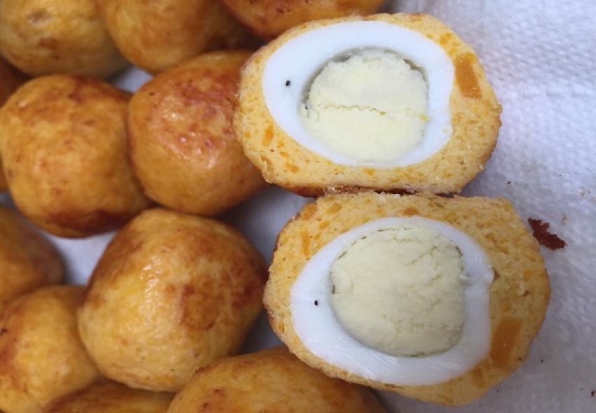 - Trứng cút luộc chín rồi bóc vỏ để nguội. Múc một lượng thịt cà rốt vừa đủ, dàn đều ra rồi đặt trứng cút vào viên tròn lại.